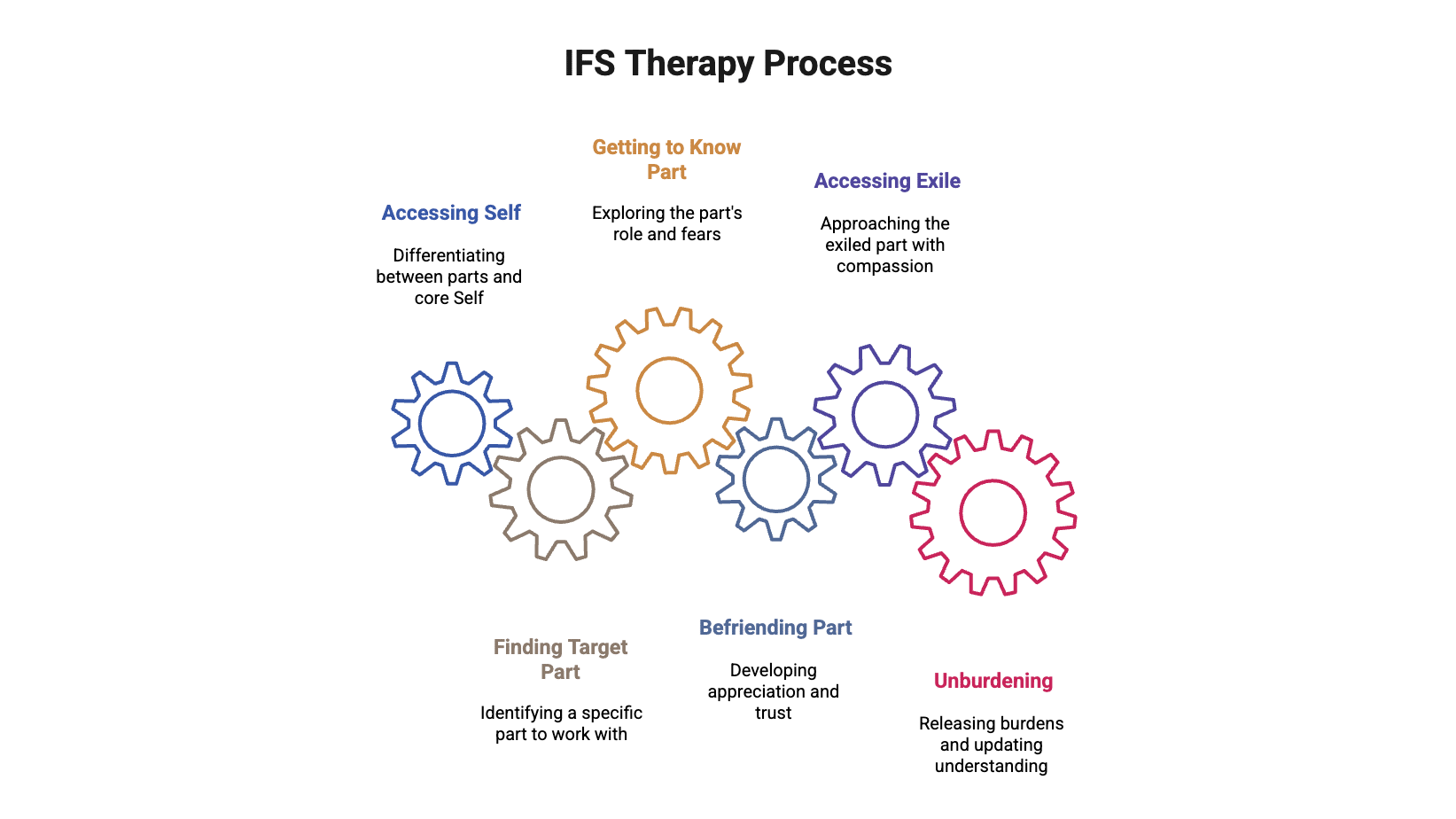 The IFS therapy process follows six main steps, though the work isn’t always linear—you might move back and forth between steps as your internal system needs: