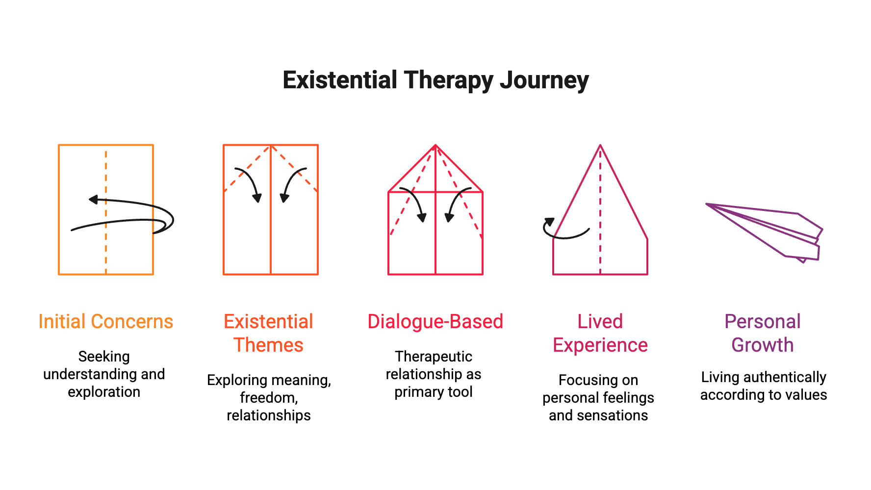 The therapeutic process is exploratory. Existential phenomenological therapy focuses on your lived experience—what things feel like for you, not what theory says they should feel like. You might explore how you experience anxiety in your physical world, how you relate to others, or what gives you a sense of vitality versus going through the motions.