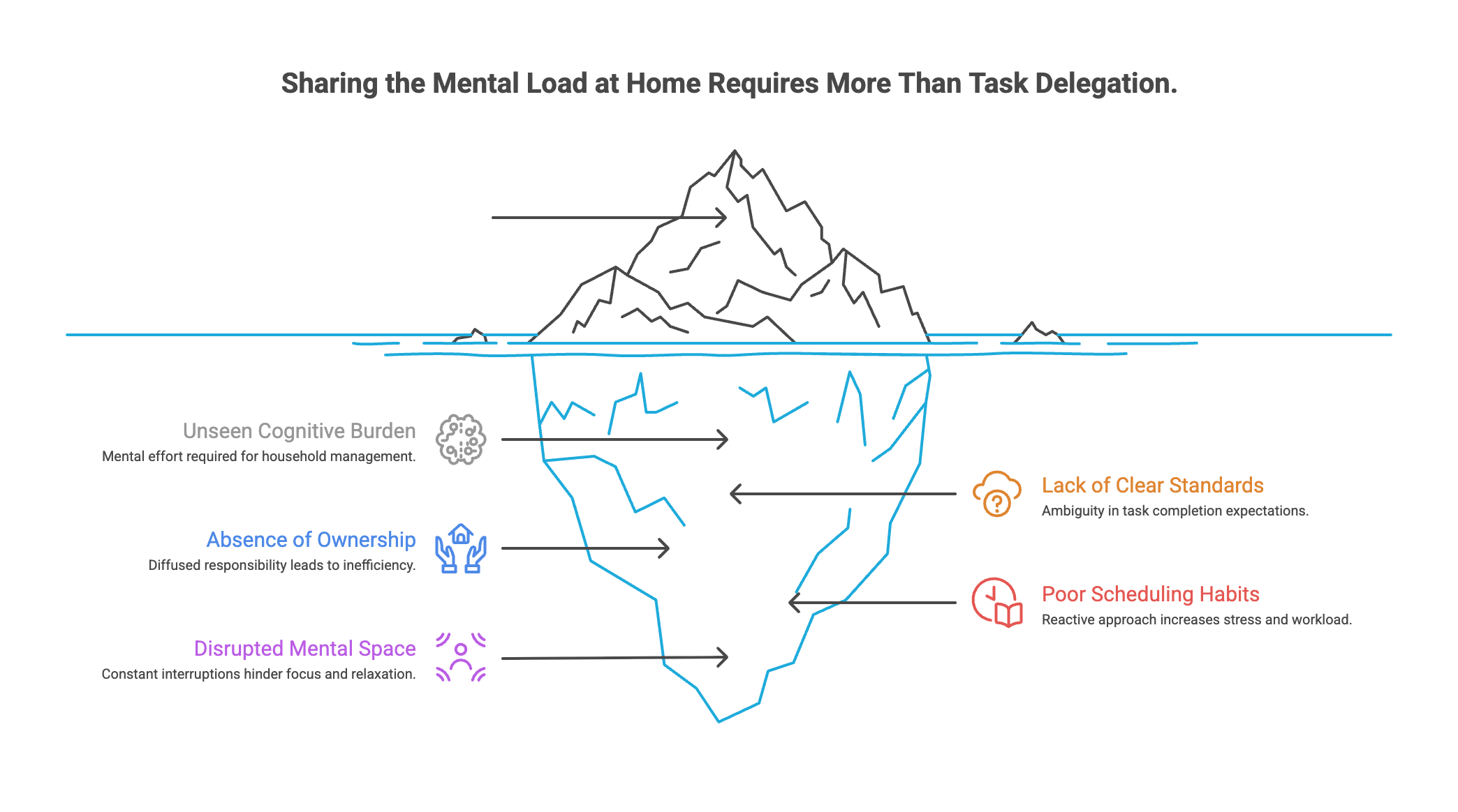 Mental load isn’t just doing household chores—it’s the thinking behind them. It’s the constant planning, anticipating, and monitoring work that runs in the background while you’re answering work emails, riding the Metro, or trying to fall asleep. In simple terms, mental load is the cognitive household labor that keeps home and family life moving.
