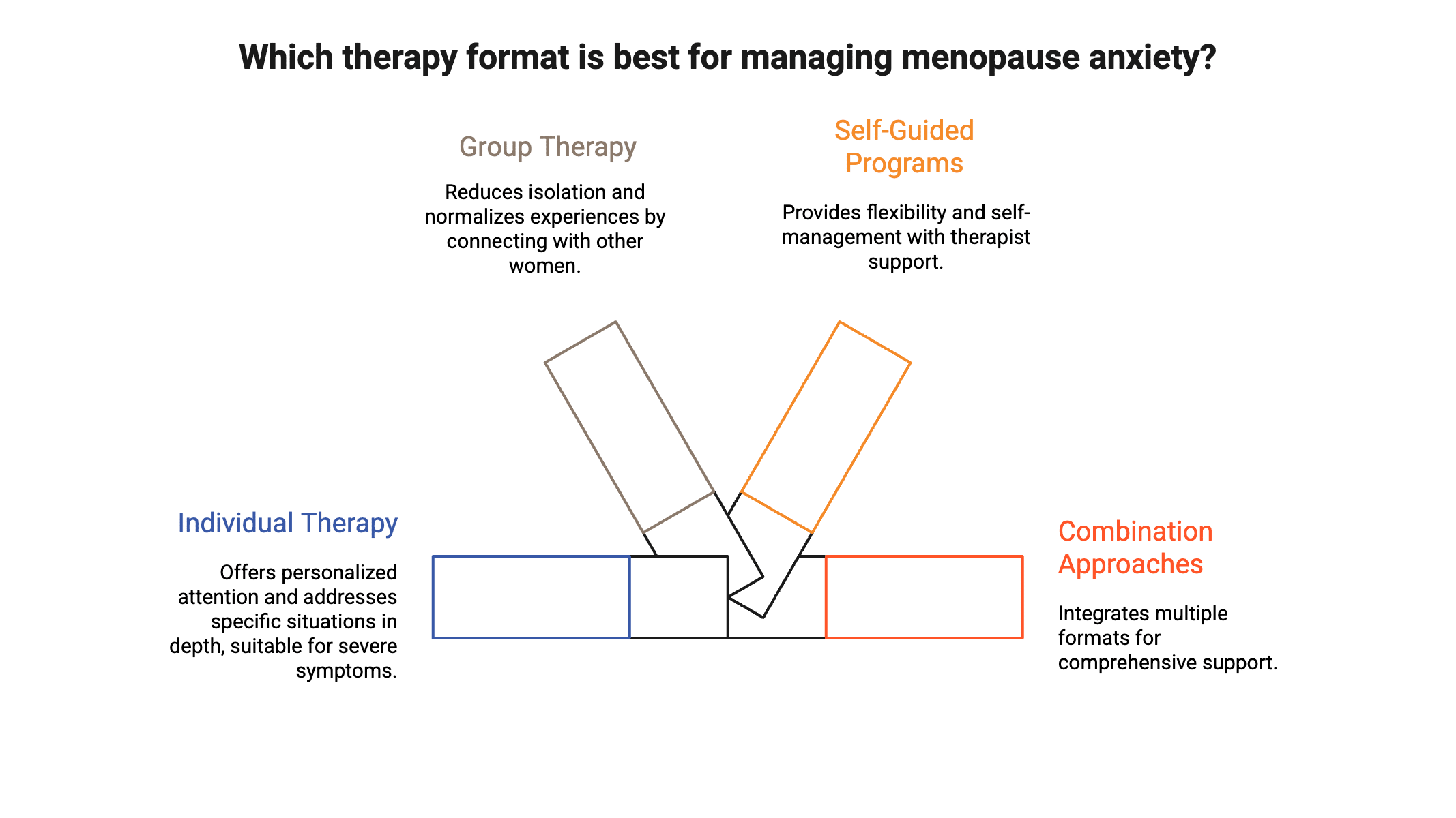 Therapy for menopause anxiety can be adapted to fit your life. Research supports multiple delivery formats for managing menopause anxiety, all of which show positive results:
