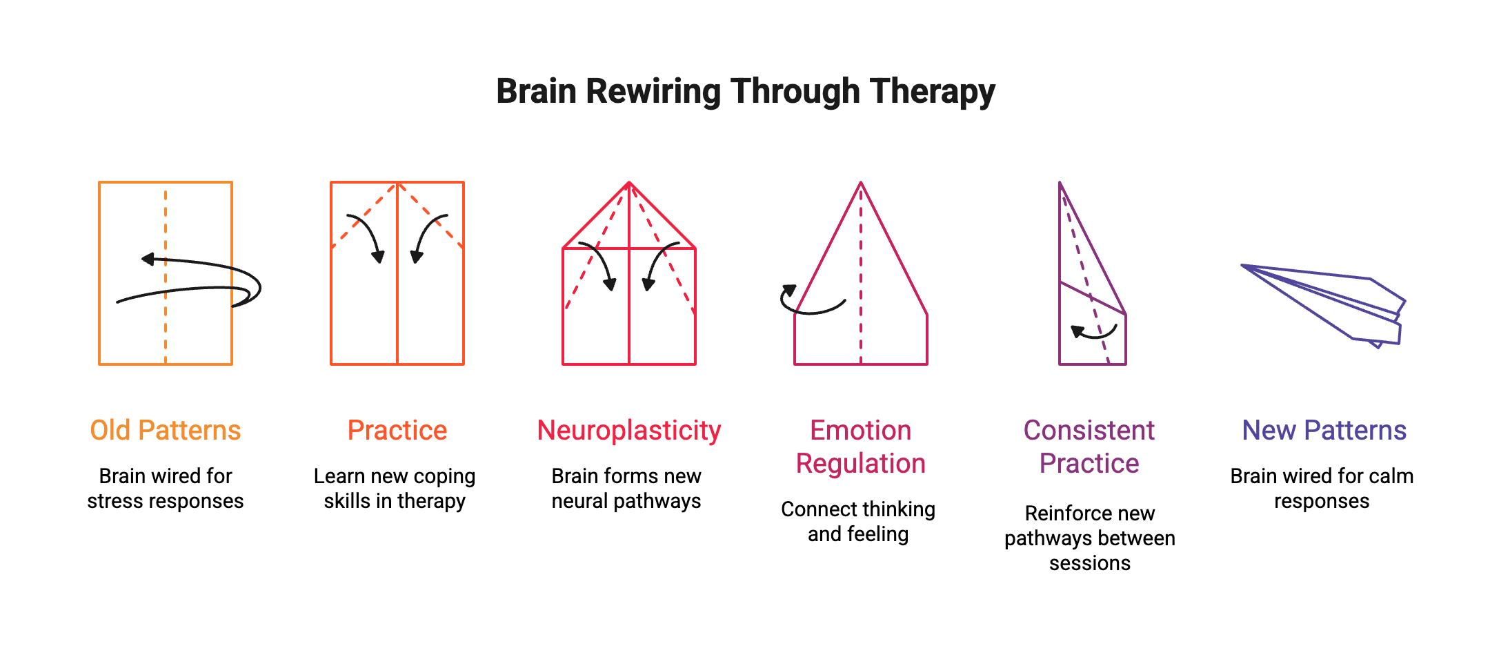 Psychotherapy creates neuroplasticity—the brain’s ability to form new neural pathways—by giving you repeated practice with healthier responses to stress.
