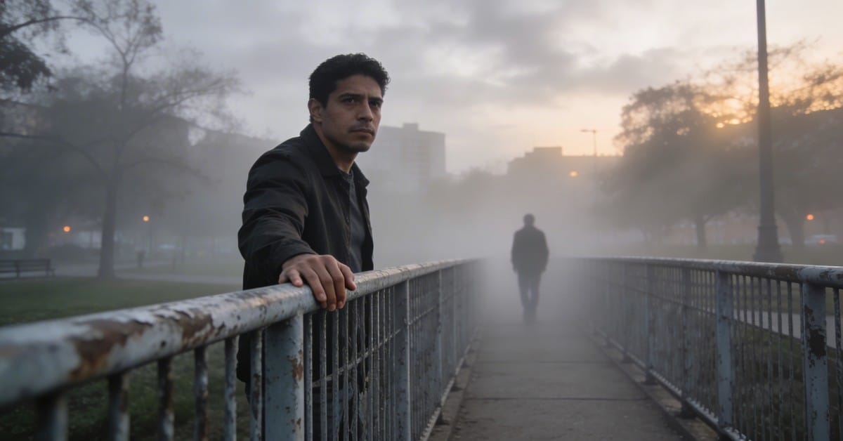 relationship anxiety — A person standing alone on a fog-covered pedestrian bridge at dusk, one hand resting on the railing...