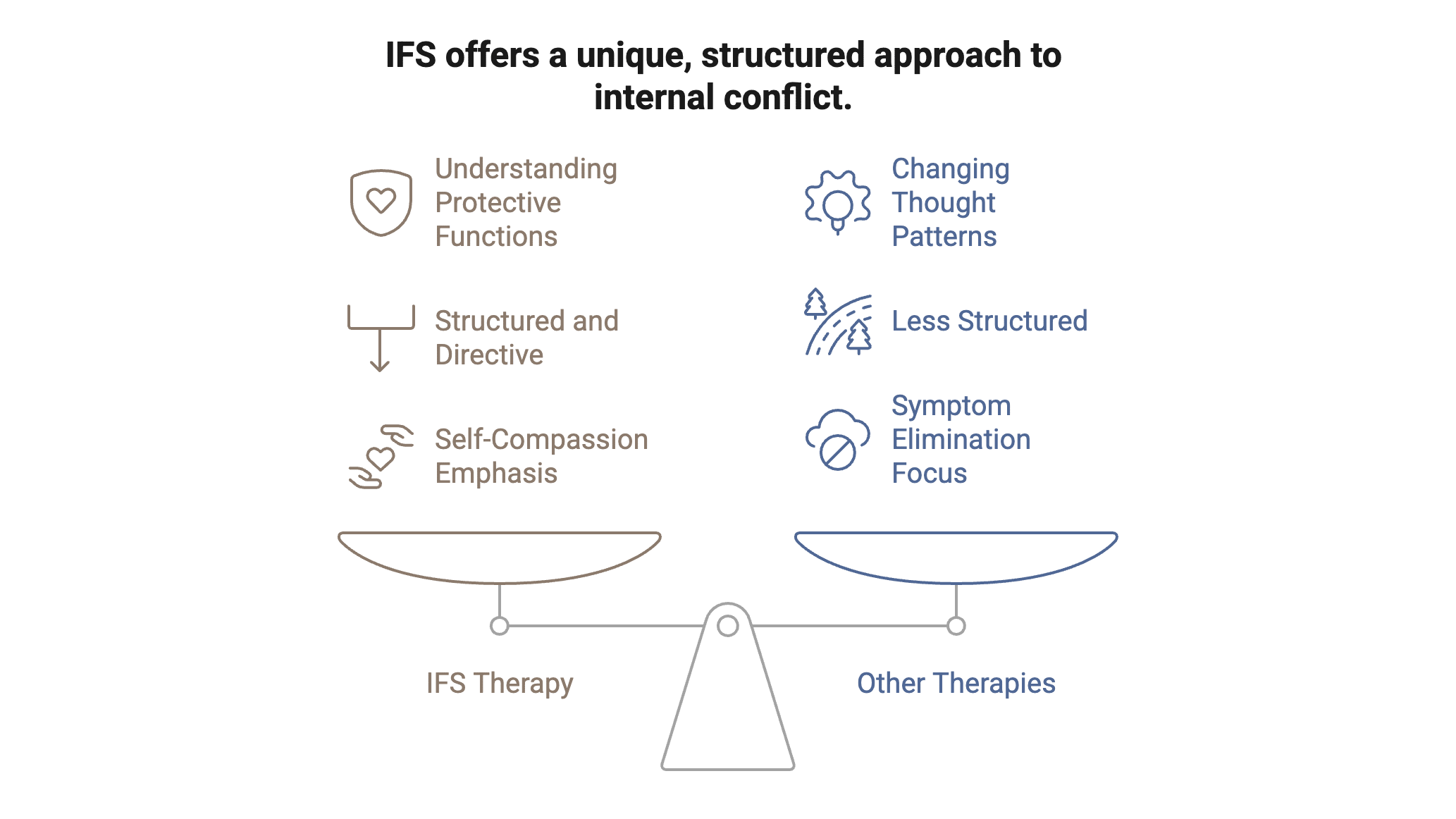 IFS therapy stands out for its non-pathologizing view of mental health. Rather than labeling symptoms as disorders to be eliminated, IFS conceptualizes them as protective strategies developed by different parts. This reframe can reduce stigma and help people engage more openly with therapy.