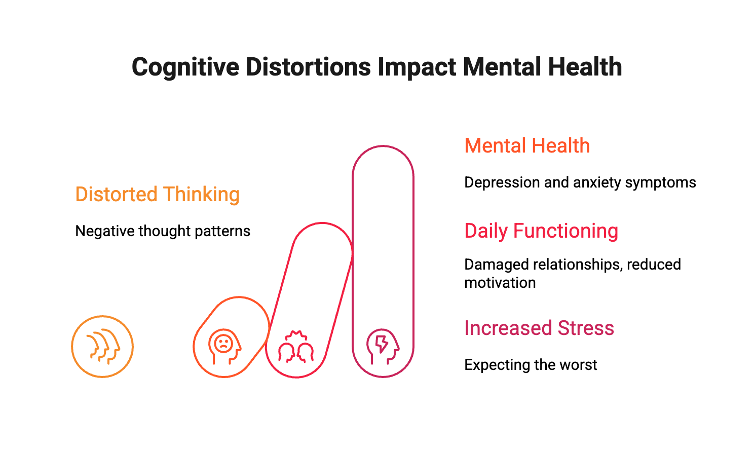 Cognitive distortions directly impact your mental health by maintaining and intensifying negative emotions. When you consistently engage in distorted thinking, it affects how you feel about yourself, your relationships, and your life.